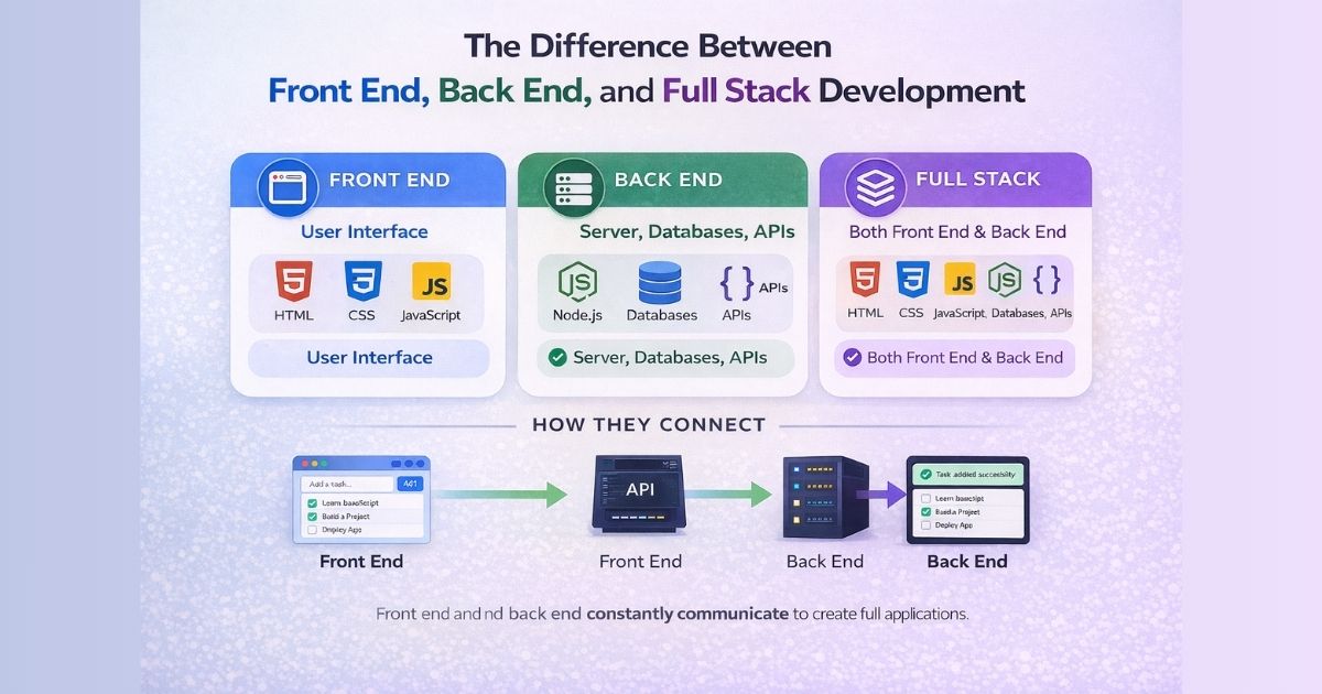 When you start exploring web development, three terms come up almost immediately: front end, back end, and full stack. They are used so often that it is easy to assume you already understand them. But the differences between the three roles shape everything from what you learn to the kinds of jobs you can pursue. This guide explains what each one actually means, what developers in each role spend their time building, and how to think about which direction fits where you are going.