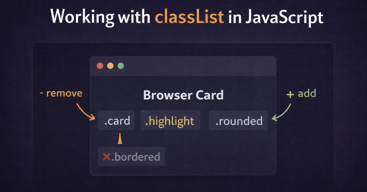 The classList property gives you a clean, purpose-built API for adding, removing, toggling, and inspecting CSS classes on any HTML element. It’s available on every element in the DOM and works in all modern browsers with no dependencies required.