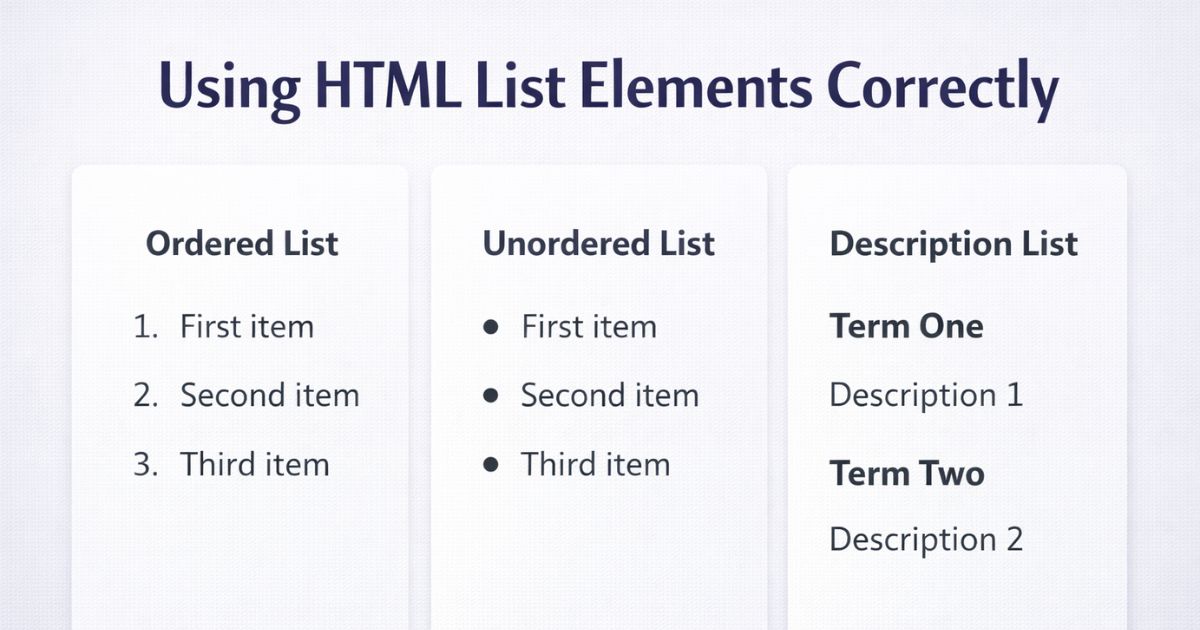 HTML provides three list elements: <ol> for ordered lists, <ul> for unordered lists, and <dl> for description lists. Choosing the right one isn’t just about appearance — it affects the meaning of your content and how assistive technologies interpret it. This guide covers when to use each element, how to style them, and the accessibility considerations that apply.